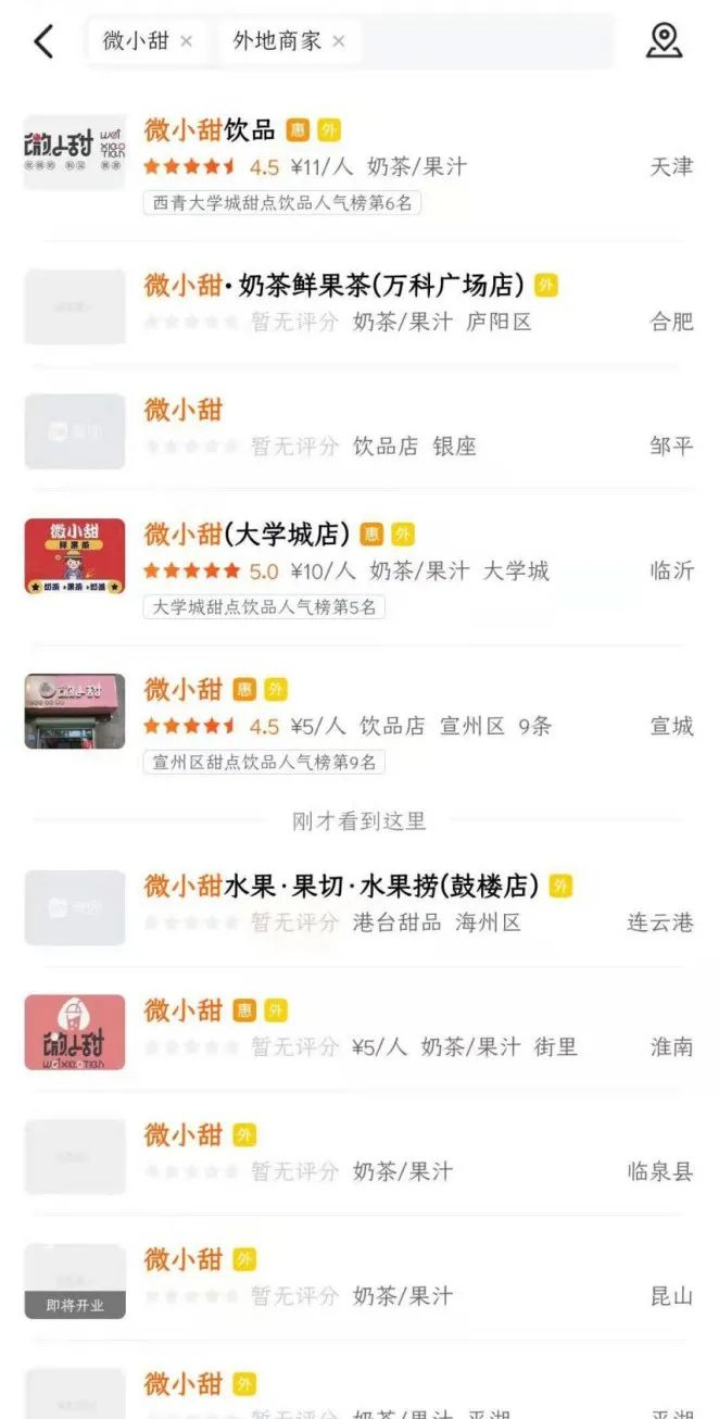 当在高德地图、美团上检索“公主茶妆”“向南巷”“微小甜”,可以发现,这三家品牌都有各自的实体门店,但门店数量并不多,相对多一点的是微小甜,在美团上,加上“即将开业”和“暂无评分”的门店,有33家,与他们所说的百位数门店有很大的差距,评分数最多的门店也只有166人评。