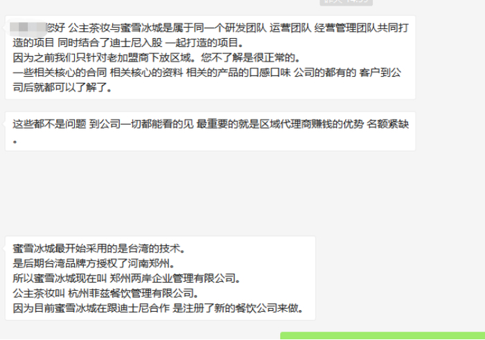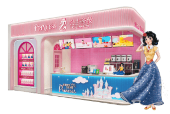 继续交流,这位负责招商的工作人员透露,公司目前的重心在于二期项目的打造,也是奶茶,即一款名为“公主茶妆”的品牌。“公主茶妆是蜜雪冰城总公司与迪士尼乐园花了1.2亿打造的项目,走的是年轻人路线。奶茶越来越年轻化,蜜雪冰城也需要不断去更新换代迎合年轻人群需求。”