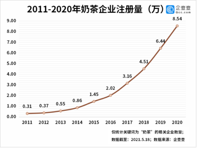 企查查数据显示,2011年以来的十年间,奶茶行业蓬勃发展,企业注册量逐年增长,2011年共注册相关企业0.31万家,到了2020年,注册量达到了十年之最,共8.54万家,同比增长33%。