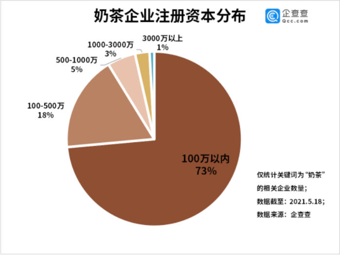 从注册资本来看,注册资本在100万元以内的奶茶企业数量最多,占比高达73%,规模普遍较小。注册资本在100-500万元和500-1000万元的分别占18%和5%。