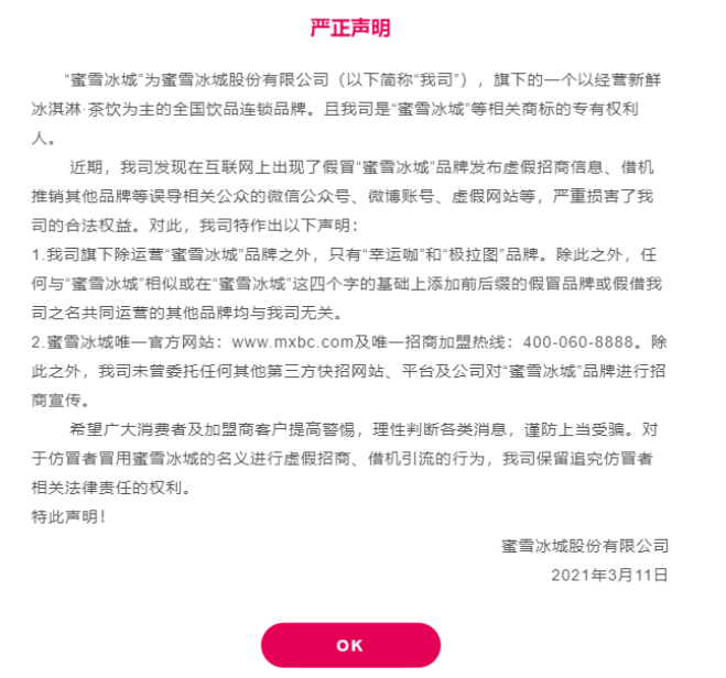 打开蜜雪冰城的官网,一封《严正声明》弹出,正是蜜雪冰城关于虚假招商加盟的声明。明确强调有不少假冒品牌发布虚假招商信息、借机推销其他品牌等误导情况。