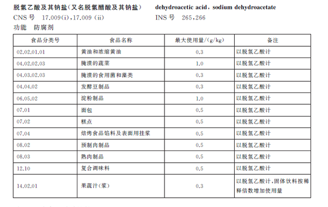 现行有效的《食品安全国家标准 食品添加剂使用标准》(GB2760-2014)规定,脱氢乙酸及其钠盐的应用范围包括面包、糕点、焙烤食品馅料及其表面用挂浆、淀粉制品、黄油和浓缩黄油等。其中,面包、糕点的最大使用量为0.5g/kg。