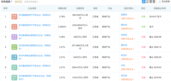 以苏州融蕴为例,该企业成立于2016年7月,注册资本约984.54万元,法定代表人为顾继伟,经营范围涉及房地产开发、物业管理,未出现对外投资的迹象。