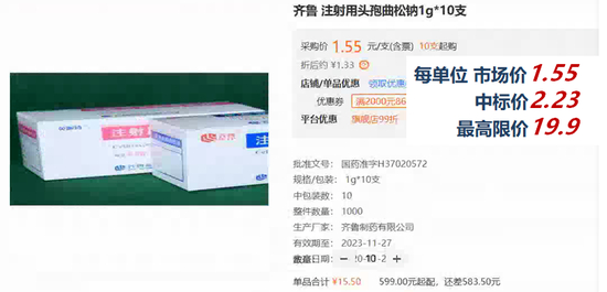 头孢曲松也出现了相似情况,齐鲁制药以2.23元(1克)中选,但在批发电商上、供应小终端的价格约为1.55元。此次集采结果官宣后,不少读者在行业媒体赛柏蓝文后留言表示:头孢类注射剂较之省级带量中标价普遍上涨。不过,除了头孢类注射剂,口服药品也存在上述价差。