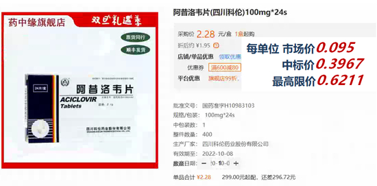 科伦药业以0.3967元/片(0.1克)中选的阿昔洛韦片,其在批发平台上售价为0.095元;