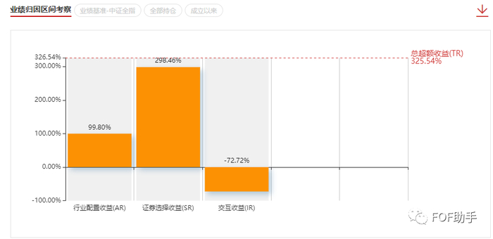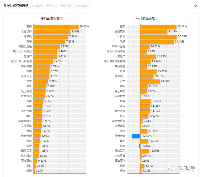 最后,行业收益贡献是把个股收益的贡献,按照个股的行业属性,汇总到了行业层面。这样一来,行业收益贡献既涵盖了行业配置的收益贡献,也涵盖了个股选择的收益贡献。通过这个功能,可以进一步分析这个基金产品更擅长于投资哪个行业。