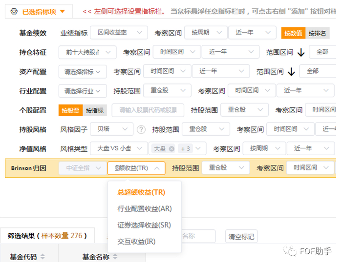 最后,在基金筛选模块中,我们也加入了Brinson归因指标。从而您可以根据基金经理的分解业绩,如选股效应、行业配置效应等做基金筛选,这样其实就是在构建基于基金经理能力视角的筛选体系。