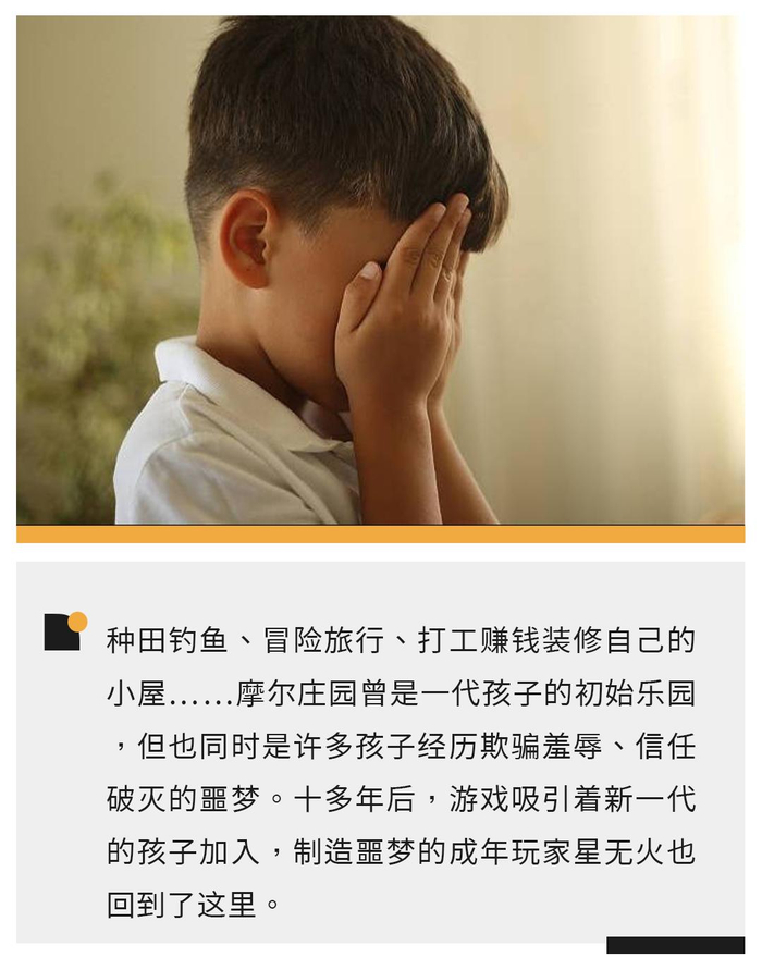 今年儿童节,一度停服的《摩尔庄园》游戏重新上线。当成年的摩尔们重拾童年回忆时,一个被尘封十年的名字也被再次提及——他是很多小朋友的童年阴影,成年玩家“星无火”。他曾详细记录了如何诈骗和盗取数百个孩子游戏账号、毁掉他们的心血、持续进行人身攻击羞辱。那些孩子顶着侮辱性的名字,在恶魔的庄园里不停劳作,只为了能找回自己被清空的道具。