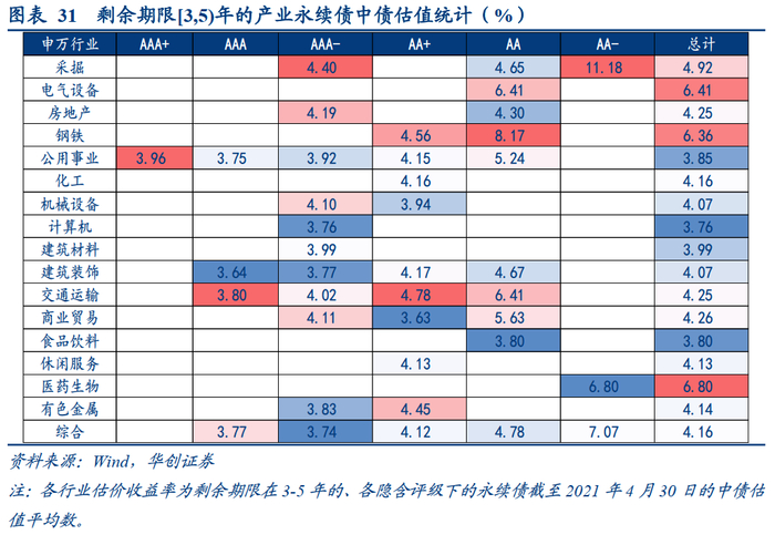 对于剩余期限在[3-5)年区间的产业永续债,AAA-级及以上的标的数量可观,可以积极挖掘采掘、公用事业、商业贸易、机械设备等行业标的,不建议过度下沉。