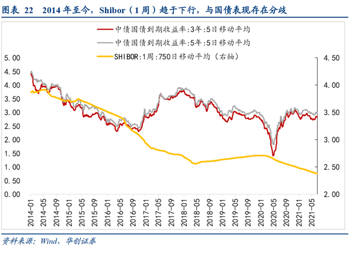 其三,永续债基准利率的“锚”通常包括Shibor(1周)和同期限国债收益率两类,当前阶段来看,选用前者的,重定价利率大概率面临下行。多数企业在设定重定价周期利率时,采用基准利率调整和加点并用的方式,也有部分企业采用上一期票面利率加点的方式定价。从历史数据看,Shibor(1周)的750日均值自2014年以来趋于下行,幅度在150bp左右,因此选用这一基准利率的永续债,其重定价期的票面利率可能会受此影响而调降;而对于“锚”为国债收益率的,其基准利率更能体现当下的市场利率,重定价的票面利率相对客观。