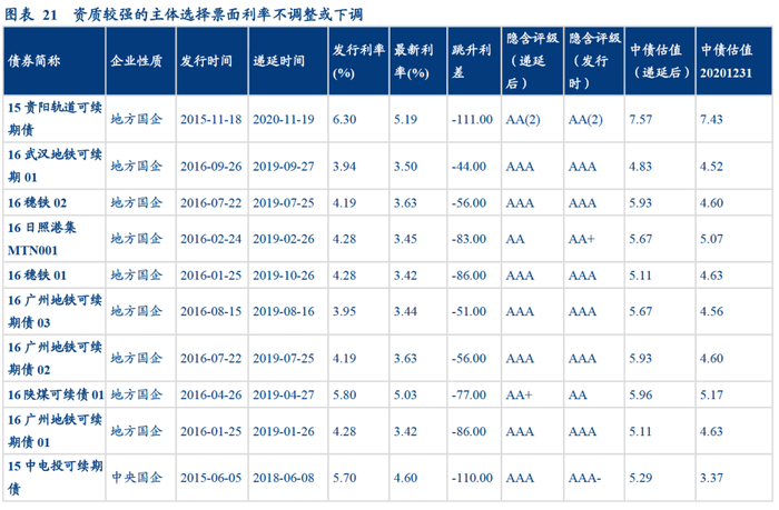 截至2021年4月30日,共有41支永续债发生过展期或递延付息事件,其中有部分永续债的票面利率出现持平上期或下调的情况,我们按票面利率、中债估值和隐含评级的变化情况分为两类:因信用恶化而“被动永续”;因资质较优、条款强势而选择“主动永续”。