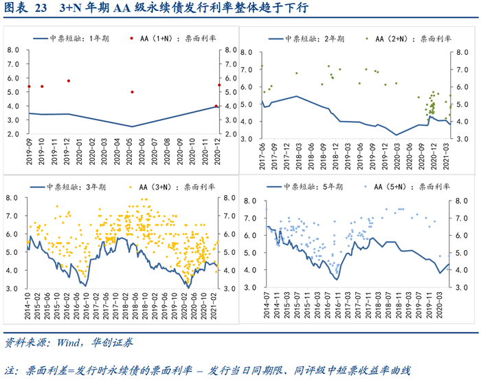 (3)2020年以来,3+N年期品种的发行占比开始下降,1+N、2+N年期品种开始扩张。2021年前4月,3+N年期一般永续债的发行规模占比约为69%,较2018年的85%明显下降,与此同时,行权期在1-2年的永续债发行占比上升至31%,而2018年这一比重为4%。