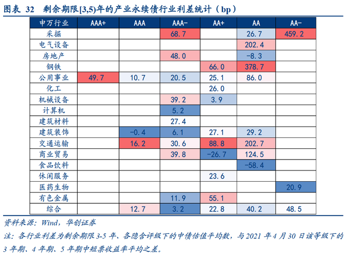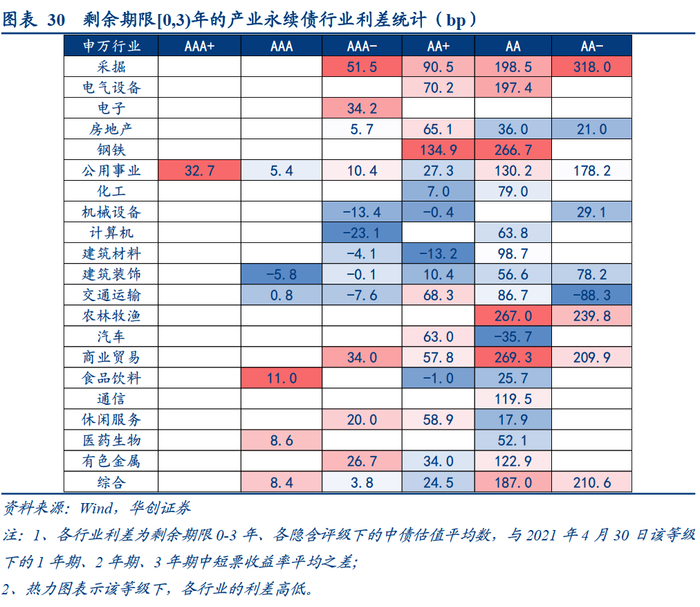 行业方面,建议关注上游挖掘机会。截至4月30日,剩余期限为0-3年的产业永续债中,AAA-级以上的标的利差偏薄,可挖掘空间有限,AA+级标的相对较多,可以重点关注采掘、钢铁、电气设备、交运、房地产等利差保护充足、景气度较高的行业。