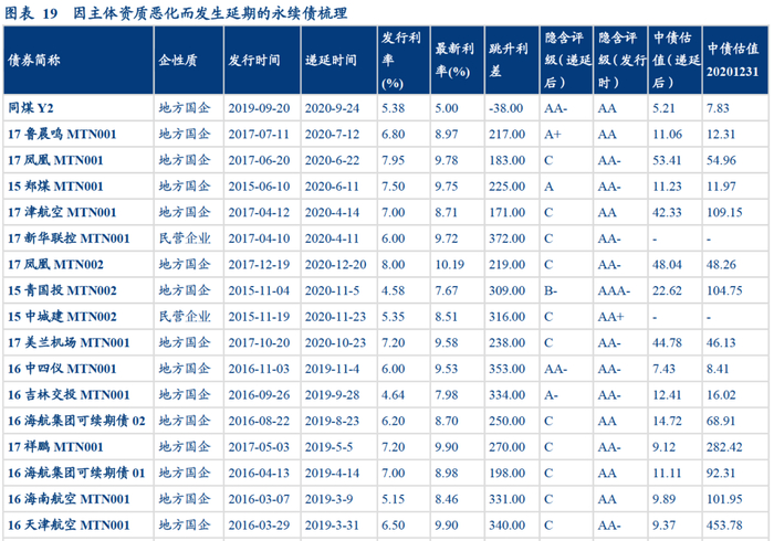 从估值收益率来看,“被动永续”事发后,当期永续债多数会显现出高收益债属性,造成估值损失。如前所述,期满不赎回通常意味着信用恶化与违约风险上升,因此展期后的永续债中债估值大概率飙升。尽管延期后投资人可能会得到票面回报上的补偿,但部分永续债利率跳升的幅度仍不及其估值损失。