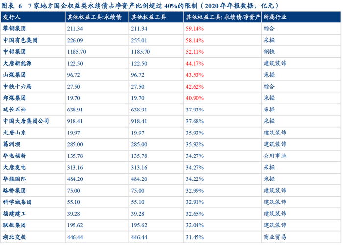 我们测算了存续一般永续债发行人的负债结构,发现在上述监管标准之下,有部分企业或面临调整压力。根据发行人披露的2020年报信息,我们对所有存续永续债的发行人——462家地方国有企业的“其他权益工具——永续债”科目占净资产的比重进行统计,结果显示,有7家发行人这一占比超过40%,不满足监管要求,另有16家主体这一占比在30-40%。