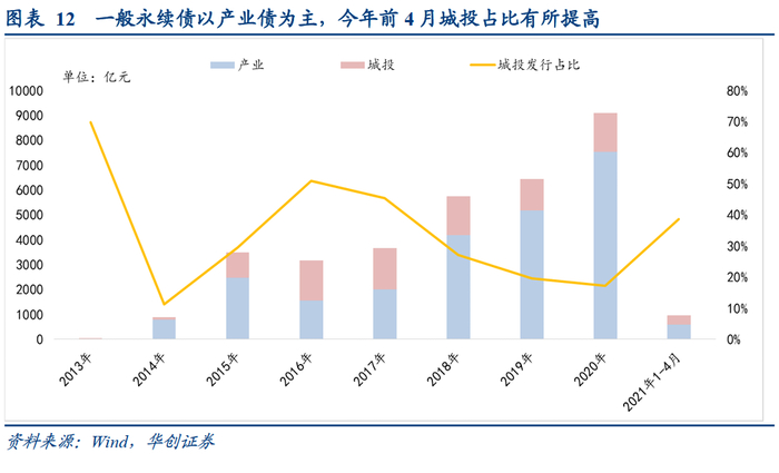产业主体仍是一般永续债的发行主力,存量占比在80%以上。2016、2017年,城投债发行占比短暂高位,基本持平产业债,一是2015年公司债开启发行之后,城投债迎来加速扩容期,城投永续债跟随放量;二是彼时在上游去产能、金融严监管的影响下,市场对于产业主体相对谨慎,城投信仰较强。2018-2020年,国有企业“降杠杆”三年行动,上游产业企业发行规模攀升,城投占比相对回落;2021年前4月,城投永续债发行占比再度回升,一定程度上与永续债纳入国有企业负债考核、“降杠杆”目标完成,产业主体发行放缓有关。