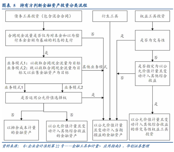 综合业务模式、合同现金流量特征,持有方可判断金融资产的分类。(1)以收取合同现金流量为目的,同时满足本金+利息的合同现金流量特征的,分类为AC;(2)兼具收取合同现金流和出售目的的,同时满足本金+利息的合同现金流量特征,分类为FVOCI;(3)上述二者之外的,归类为以公允价值计量且其变动计入当期损益的金融资产(FVPTL)。