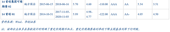 其一,前N个重定价周期的重置票面利率不加点。例如“16广州地铁可续期债01”以3个计息年度为1个重定价周期,条款约定在前5个重定价周期内,均不设置利率跳升机制,同时在每个重定价期结束时点具有是否赎回的选择权。这意味着发行人在发行后的第1-15年适用同一票面利率(3.42%),当市场利率下行,本期票面利率偏高时,发行人有权赎回后再新发,降低融资成本;当市场利率上行时,发行人可以不赎回,保持较低的成本水平。因此在这类条款下,发行方拥有很强的融资成本议价权,通常由资质较优的主体采用。