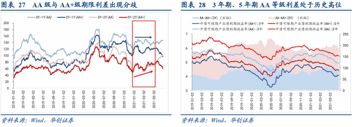 AA级永续债的品种利差呈现相似特征。1年期、2年期、3年期品种利差比去年末分别收窄41bp、14bp、11bp,幅度不及AA+;5年期持平,说明市场对城投永续债的下沉和拉长久期均较为谨慎。