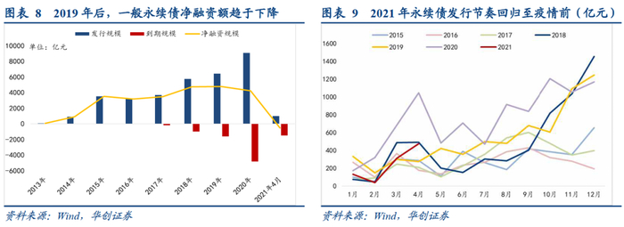 2021年1-4月,一般永续债发行规模955.2亿元,发行节奏与疫情前的往年同期水平相当,4月发行量小幅增长。但结合到期量看,3、4月迎来年内到期小高峰,永续债累计净融资额落入负区间,显示企业增量发行的意愿较弱。这一方面或与2021年4月新政将企业永续债归入债务风险管控范围有关;另一方面,2020年底,中央企业平均资产负债率降至64.5%,超额完成降杠杆减负债三年收官任务,在2021年“稳杠杆”的背景下,央企进一步去杠杆的动力不强。