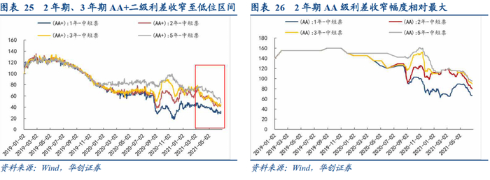 期限利差趋于走扩,高等级、长久期品种需求边际改善。截至6月23日,相较于去年末,AA级5年期城投永续债的期限利差持续走扩,市场短久期偏好进一步凸显;AA+级呈现相似特征,不过在5月曾出现一轮小幅收窄,结合收益率看,当月5年期AA+城投永续债收益率累计下行25bp,超过同期中短票,显示“欠配”背景下,部分机构开始关注城投永续债的期限利差收益。等级利差方面,目前AA与AA+之利差位于历史相对高位区间,3年期、5年期等级利差分别在76bp、88bp,比去年末走扩21bp、15bp,显示机构下沉意愿较弱。