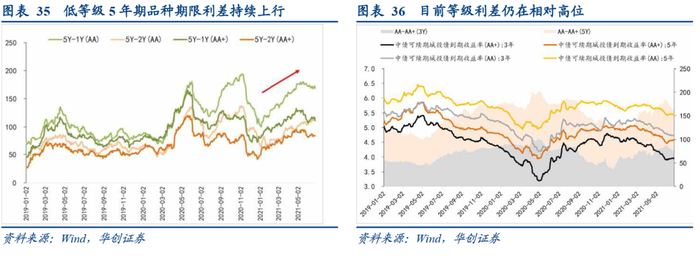 期限利差方面,今年1-4月,5年期品种与1年期品种之利差趋平,而与2年期利差持续走扩,反映彼时市场拉长久期的意愿不足,5年期与存量较少的1年期品种需求相当,而2年期品种需求较好。5月之后,AA与AA+期限利差表现分歧:AA级期限利差走扩;而AA+级加速收窄,说明市场开始挖掘高等级永续债的期限收益。结合等级利差来看,目前3年期、5年期下的AA与AA+之等级利差处于历史相对高位,也说明配置资金下沉意愿不足。