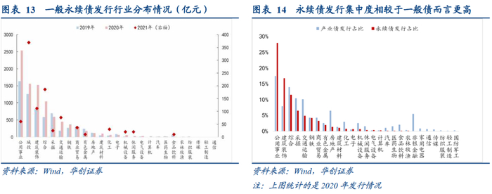 一般永续债发行行业分布较为集中,“重资产”、“高负债”特征突出。2020年,发行规模前三的行业(公用事业、综合、建筑装饰)占产业永续债发行总规模的比重为68%,超过当年三者所有信用债发行合计占比(39%),说明永续债行业集中度更高。