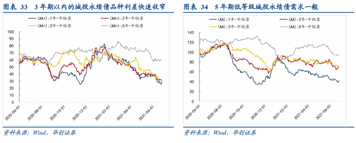 分等级来看,年初至今,AA+级城投永续债5年期品种利差整体保持稳定,5月下旬经历了一轮快速收窄后继续维持在60bp左右,持平上年末;而1年期、2年期和3年期的品种利差自1月以来持续下行,相较于2020年末分别收窄了45bp、39bp和34bp,利差点位均在31bp左右,处于历史低位区间。这一分化表明,对于高等级城投永续债,资金整体上更偏好短久期,但是相较于年初,5年期品种需求有边际改善的迹象。