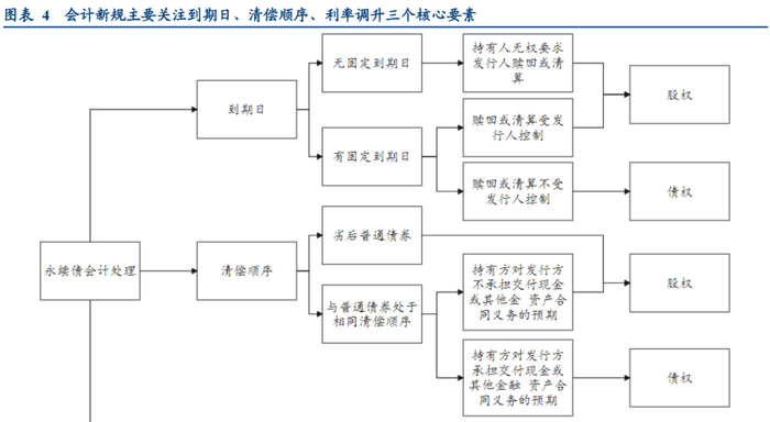 (2)关于清偿顺序。一是,若合同明确规定永续债劣后清偿,则表明没有交付现金的合同义务,可列为权益;二是,若合同未规定次级属性,即与其他普通债务相同顺序清偿,则需要“审慎考虑会计分类”,判断是否会导致持有方形成“发行方将会承担交付现金义务”的预期。《规定》的这一表述实际为企业确定会计分类留下了自主判断的空间。