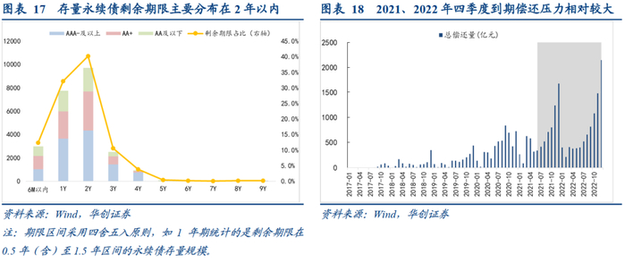 存量永续债的剩余期限主要分布在2年以内。一方面,2015-2016年,一般永续债迎来第一波供给高峰,彼时发行期限以5+N为主,对应到期日在2020年-2021年;另一方面,2017-2020年,3+N年期品种接棒成为主要发行品种,尤其是2020年发行放量,这部分债券对应的剩余期限在2年以内,两轮到期高峰叠加,或导致2021、2022年一般永续债的赎回压力明显增加。结合当前1+N、2+N品种发行占比提升的这一现象来看,一般永续债的久期中枢趋于缩短,未来品种的流动性也有望改善。