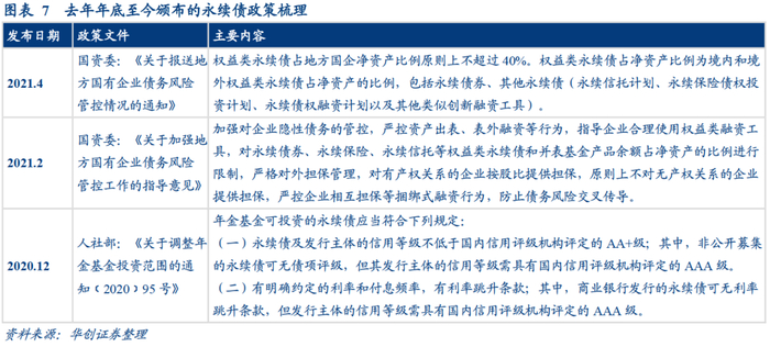 针对发行端,2021年以来监管政策密集出台,监管部门明确重点监测的地方国企权益类永续债上限,严控债务风险。2021年3月26日,国务院国资委印发《关于加强地方国有企业债务风险管控工作的指导意见》,要求各地方国资委 “指导企业合理使用权益类融资工具,对永续债券、永续保险、永续信托等权益类永续债和并表基金产品余额占发行方净资产的比例进行限制”;2021年4月,国资委下发《关于报送地方国有企业债务风险管控情况的通知》,明确被纳入债务风险重点管控范围的地方国企“权益类永续债占净资产比例不得超40%”。此前地方国企多借助发行永续债降杠杆,实则加大了财务报表的脆弱性,控制权益类永续债新增规模也体现出“防风险”的政策思路。