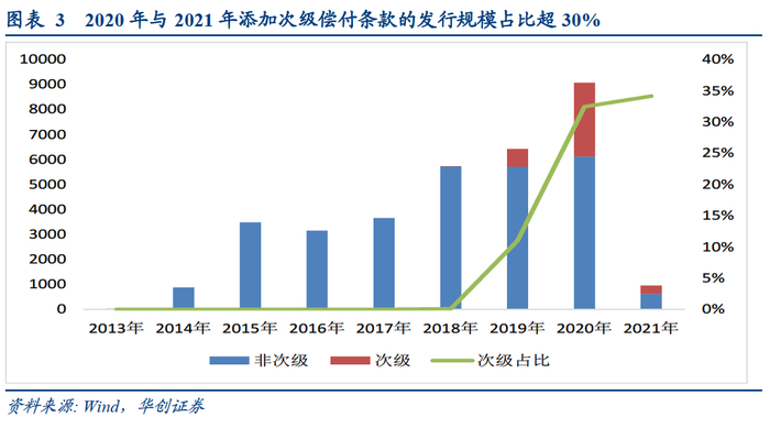 其四,偿付顺序是判断“股性”与“债性”强弱的重要标准。2019年财政部印发的《永续债相关会计处理的规定》中明确,“发行方清算时永续债劣后于发行方发行的普通债券和其他债务的,通常表明发行方没有交付现金或其他金融资产的合同义务,在财报中也可以作为‘长期资本工具’进行列示,不计入企业负债”,鉴于此,越来越多的发行人在永续债条款上加入次级条款,以贴合监管层面对于权益工具的认定。从数据上看,2019年发行的含次级条款的一般永续债占比约为10%,而2020、2021年这一比重超过了30%。