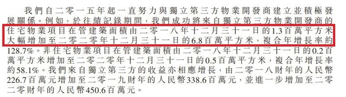我们看到,独立第三方物业开发商的住宅物业项目,在管建筑面积,由2018年末的130万平米,大幅增加至2020年末的680万平米,复合年增长率约128.7%。