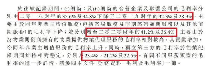 朗诗、朗诗的合营企业及联营公司的毛利率,分别由2018财年的35.6%及34.8%,下降至2019财年的32.3%及28.9%。