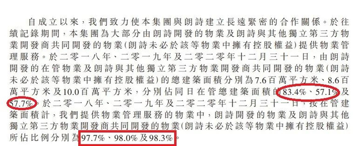 然后,2018、2019、2020年末,按在管建筑面积计,朗诗绿色生活提供物业管理服务的物业中,朗诗开发的物业及朗诗与其他独立第三方物业开发商共同开发的物业(朗诗未必于该等物业中拥有控股权益)所占比例,分别为97.7%、98.0%及98.3%。