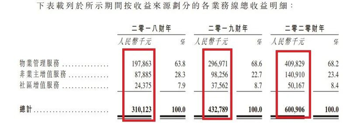 和“靠山”不够大,在管面积一般,对应的是营收自然不算很多。如下图,朗诗绿色生活,2018、2019、2020年的总营收从3亿多、4亿多到6亿元。