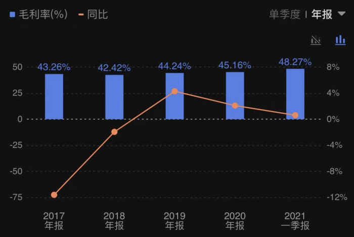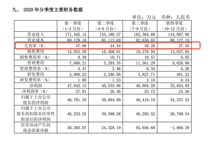 毛利率方面,片仔癀过去5年的毛利率基本平稳,但在2020年4个季度里却持续走低,年报数据显示,从2020第一季度到第四季度,片仔癀毛利率分别为47.98%、44.44%、49.20%、37.45%。对此官方解释称,公司第四季度的净利润率较前三季度有所下降的主要原因系医药制造业的销售占比减少,销售毛利率有所下降。