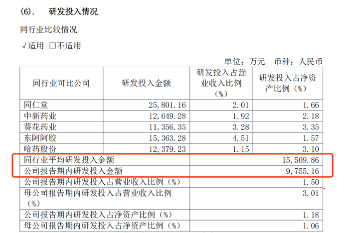相比之下,同仁堂的研发金额高达2.58亿元,东阿阿胶的研发费用为1.54亿元,同行业平均研发投入金额为1.55亿元。