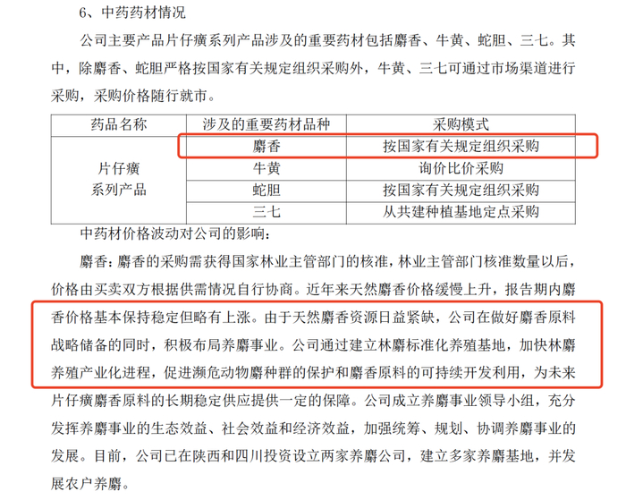 值得注意的是,虽然天然麝香极具稀缺性,但为了弥补产能不足的问题,片仔癀已经开始进人工养麝。公告显示,公司通过建立林麝标准化养殖基地,加快林麝养殖产业化进程,促进濒危动物麝种群的保护和麝香原料的可持续开发利用,为未来片仔癀麝香原料的长期稳定供应提供一定的保障。目前,公司已在陕西和四川投资设立两家养麝公司,建立多家养麝基地,并发展农户养麝。