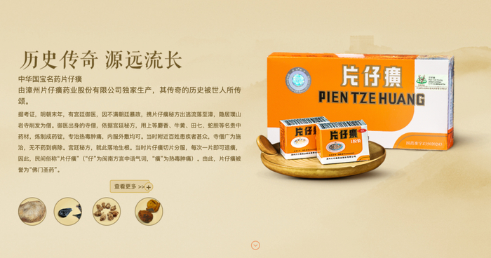 据官网介绍称,片仔癀诞生于明朝末年,有宫廷御医携片仔癀秘方逃亡至民间,当时附近百姓患疾者甚众,御医广为施治,无不药到病除。宫廷秘方,就此落地生根。当时片仔癀切片分服,每次一片即可退癀,因此,民间俗称“片仔癀”(“仔”为闽南方言中语气词,“癀”为热毒肿痛)。
