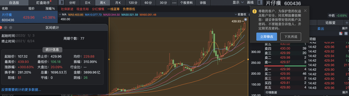 上市之初,公司的发行价为8.55元/股,但截至2021年6月24日收盘,片仔癀股价已高达428.5元/股。