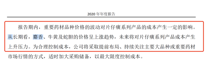 报告期内,重要药材品种价格的波动对片仔癀系列产品的成本产生一定的影响。从长期看,麝香、牛黄及蛇胆的价格呈上涨趋势,未来将对片仔癀系列产品成本产生上升压力。为合理控制成本,公司将采取提前布局、持续关注主要大品种或重要药材。