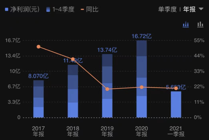 业绩方面,近4年片仔癀的营收与净利润也是持续走高,2017至2020年,片仔癀营收分别为37.14亿、47.66亿、57.22亿、65.11亿元,净利润分别为8.07亿、11.43亿、13.74亿、16.72亿元。