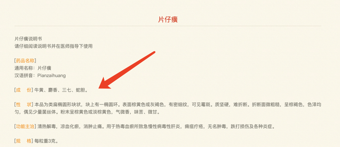 根据药品的外包装显示,片仔癀成分为牛黄、麝香、三七与蛇胆。其中天然麝香是片仔癀里最重要的成分,这一原料又极具稀缺性。