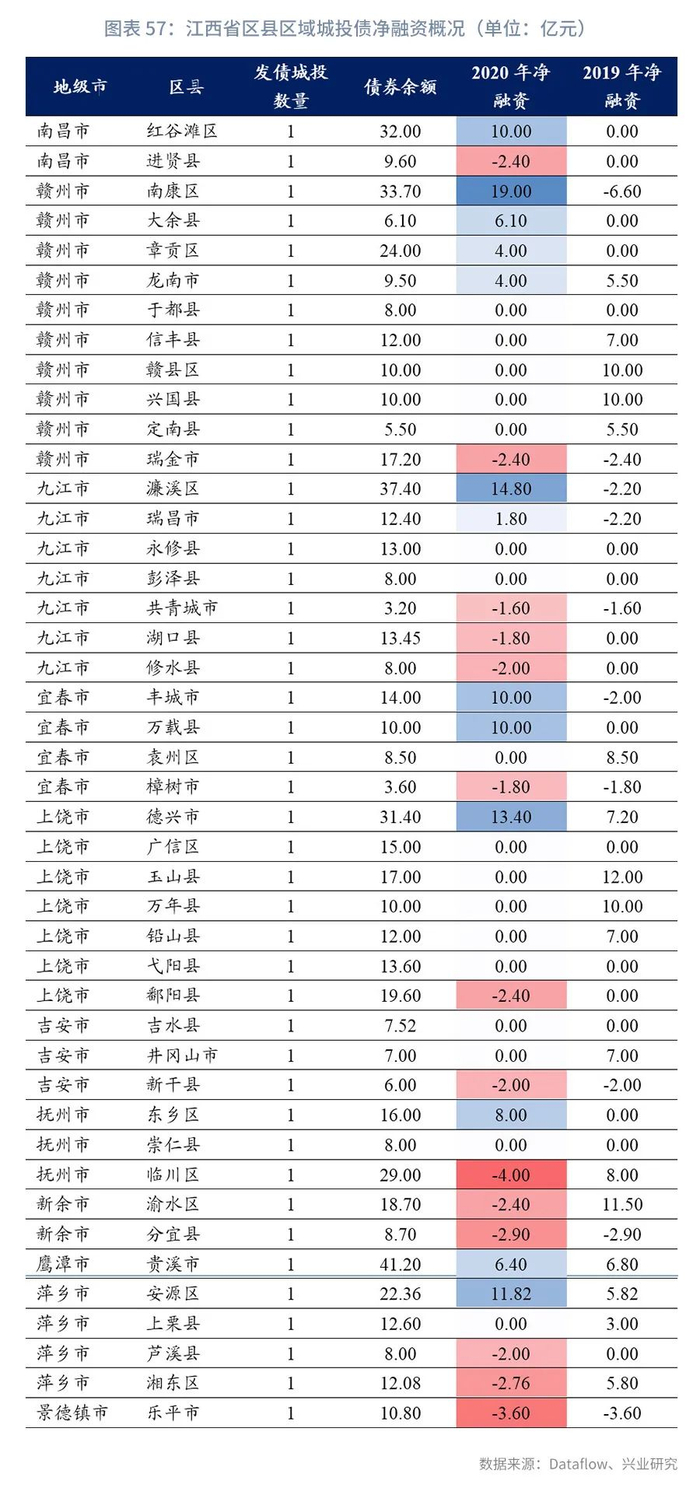 分区县来看,江西省城投平台分布于100个区县中的44个区县,各区县均只有1家公开发债城投平台,其中2020年净融资规模为正的区县共13个,最大的是南康区(19亿元);南昌市红谷滩区、九江市濂溪区、宜春市丰城市、宜春市万载县、上饶市德兴市、萍乡市安源区的净融资规模在10-15亿元;其他区县的净融资均低于10亿元。净融资为负的区县共14个,净流出规模均未超过4亿元。