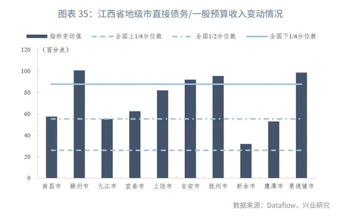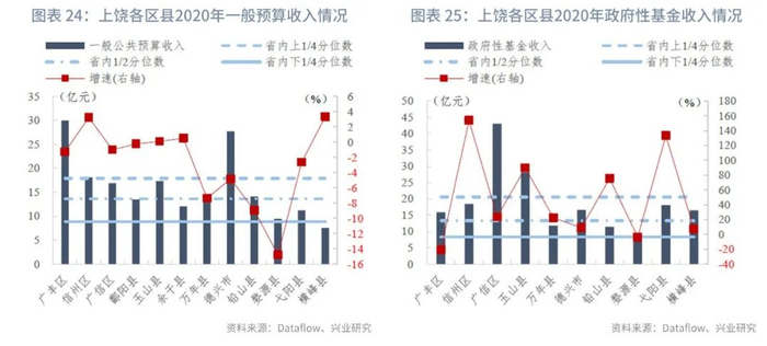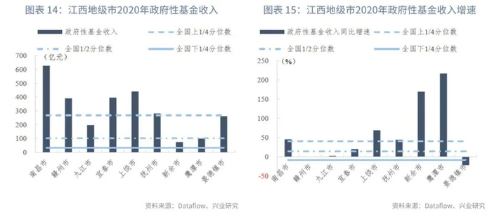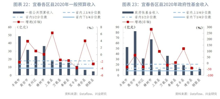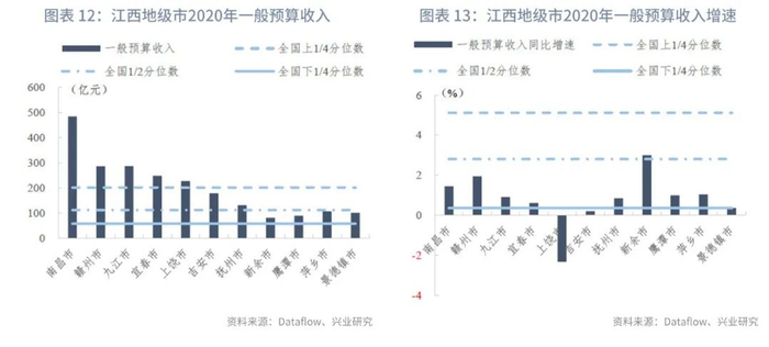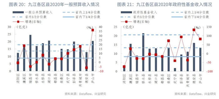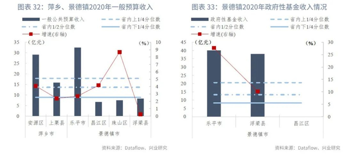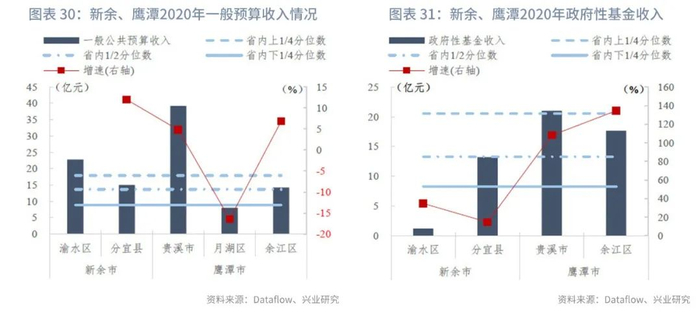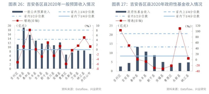 分区县来看:我们统计了江西省100个区县的一般预算收入及政府性基金收入。在已披露数据的区县中,一般预算收入的上1/4、1/2、下1/4分位数分别为18亿元、14亿元和9亿元,一般预算收入同比增速的上1/4、1/2、下1/4分位数分别为3.97%、1.46%和-2.20%。政府性基金收入的上1/4、1/2、下1/4分位数分别为21亿元、13亿元和8亿元,政府性基金收入同比增速的上1/4、1/2、下1/4分位数分别为85.49%、13.40%和-13.03%。