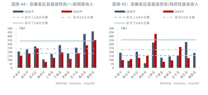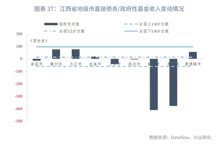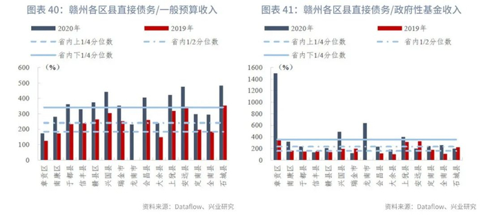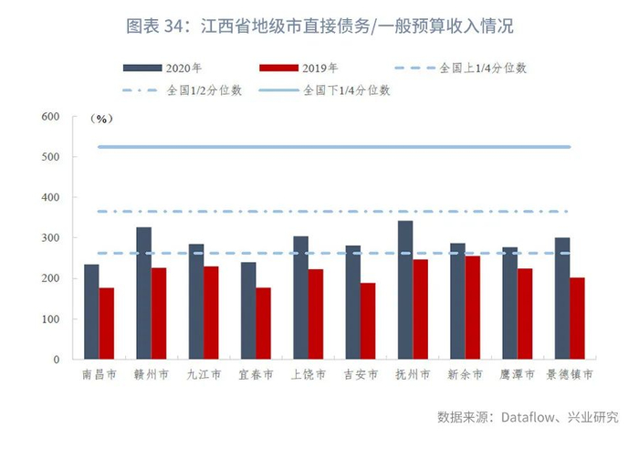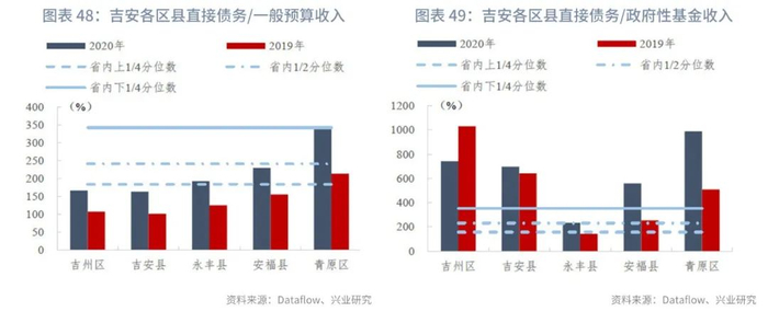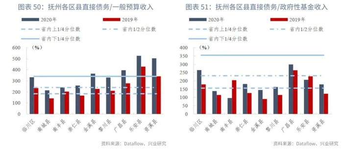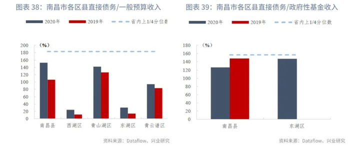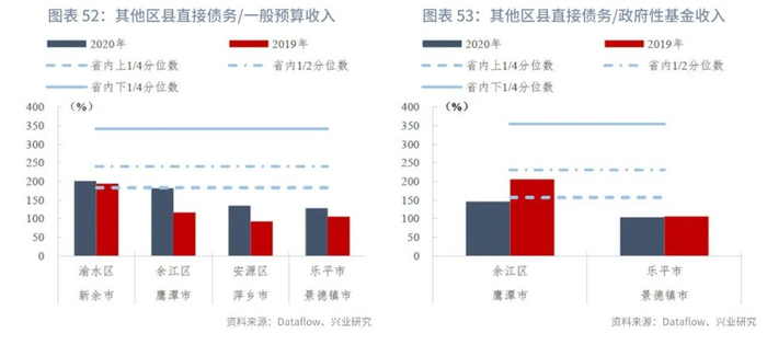 分区县来看,截至2020年末,江西省各区县直接债务/一般预算收入的上1/4、中位数和下1/4分位数分别为183.17%、240.32%、341.31%,指标变动的上1/4、中位数和下1/4分位数分别为44.11个百分点、71.76个百分点、106.86个百分点。部分市辖区政府性基金未披露或收入极低,接近于零,主要是由于土地出让金上缴市财政之后通过补助收入返还,因此政府直接债务/政府性基金收入暂不计算,剔除这些区县后其他区县的直接债务/政府性基金收入的上1/4、中位数和下1/4分位数分别为156.74%、231.19%、354.21%,指标变动的上1/4、中位数和下1/4分位数分别为-24.92个百分点、54.01个百分点、113.18个百分点。