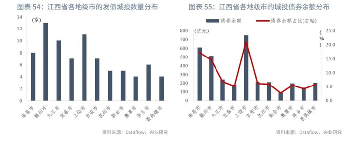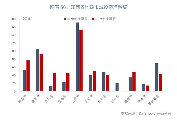 兴业研究覆盖82家公开发债的江西省城投平台,涉及江西省全部11个地级市以及44个行政区县。目前上述江西省城投平台债券余额合计3517.01亿元,2020年净融资规模622.25亿元,同比小幅增长0.14%。分地级市来看,南昌市、赣州市、上饶市的存量城投债余额规模最大,分别为603.71、508.98、743.20亿元,三者合计占全省的52.77%。其他地级市的存量债券规模主要集中在100-250亿元区间内。从净融资情况来看,上饶市的城投融资最为活跃,2020年净融资规模达到171.14亿元,同比增长11.70%;赣州市次之,为104.09亿元,同比增长12.05%。南昌市、景德镇市的净融资规模在50-70亿元,其中南昌市同比下降31.17%,景德镇市同比增长62.70%。吉安市、抚州市、鹰潭市2020年净融资规模在30-50亿元,九江市、宜春市、新余市则低于30亿元,其中九江市最小(12.30亿元)。