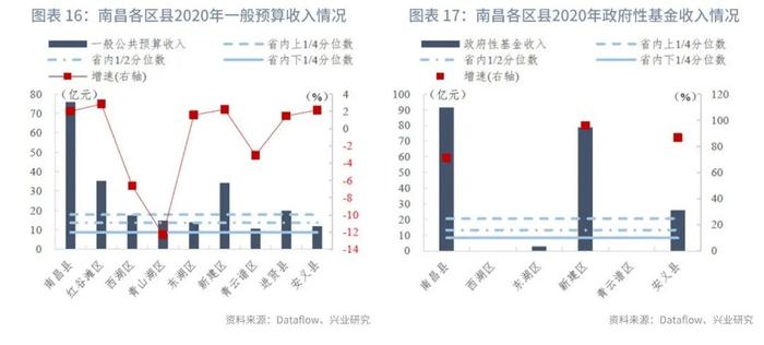 南昌市各区县一般预算收入规模较大。一般预算收入方面,南昌市下辖的9个区县中,南昌县以76亿元位于全省规模第一,远高于省内1/4分位数。此外,红谷滩区(35亿元)、新建区(34亿元)、进贤县(20亿元)也高于省内上1/4分位数。而青云谱区、依安县的规模相对较小,分别为11和12亿元,但仍然远高于省内下1/4分位数。一般预算收入增速方面,青山湖区、西湖区、青云谱区的增速均为负,其中青山湖区降幅最大(-12.30%);其他区县均实现正增长,但增速均较低,最高的是红谷滩区(2.84%)。政府性基金收入方面,各区县分化较大,西湖区、青云谱区的土地出让收入均先上缴市财政,通过转移支付收入返还,因此政府性基金收入均为零;南昌县、新建区、安义县的土地出让较为活跃,政府性基金收入均超过25亿元,高于省内1/4分位数,其中南昌县以92亿的规模位列江西省第一。政府性基金收入增速方面,已披露的区县增速普遍较高,增速均超过70%,高于全省中位数。