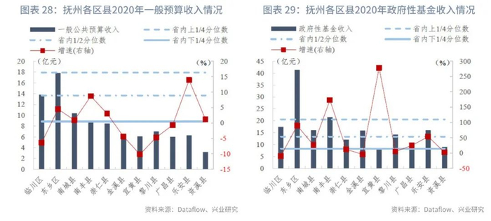 抚州市各区县的一般预算收入规模较小,政府性基金收入规模尚可。2020年仅临川区、东乡区的一般预算收入高于省内省内中位数,东乡区收入规模约为18亿元,接近省内上1/4分位数;南城县(10亿元)略高于省内下1/4分位数,其他区县均处于省内末25%区间,其中资溪县实现3亿元,为抚州市最低。一般预算收入增速方面,收入规模较小的乐安县增速最高,同比上升13.91%;降幅最大的是宜黄县,同比下降10.16%。政府性基金收入方面,东乡区远高于其余区县,达41亿元,远高于全省上1/4分位数;南丰县(22亿元)也高于全省上1/4分位数;而宜黄县和广昌县收入规模较小,约为8亿元,低于省内下1/4分位数。政府性基金收入增速方面,除临川区、金溪县略有下降,其余区县均有不同程度的上升,其中宜黄县、南丰县涨幅超过150%。